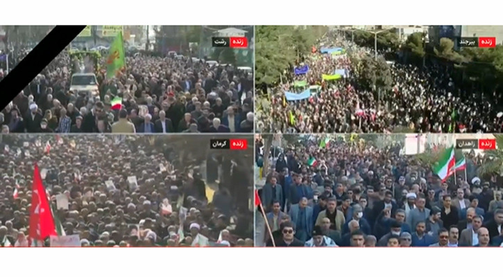 কেরমান, জাহেদানসহ একাধিক শহরের সমাবেশে অংশগ্রহণকারীদের হাতে সর্বোচ্চ নেতা আয়াতুল্লাহ খামেনীর ছবি, পবিত্র কোরআন ও জাতীয় পতাকা দেখা যায়। রাষ্ট্রীয় প্রেস টিভির খবরে বলা হয়, কেরমানের মিছিলে অংশ নেওয়া জনতা ‘আমেরিকার পতন’ কামনা করে স্লোগান দেয়।
