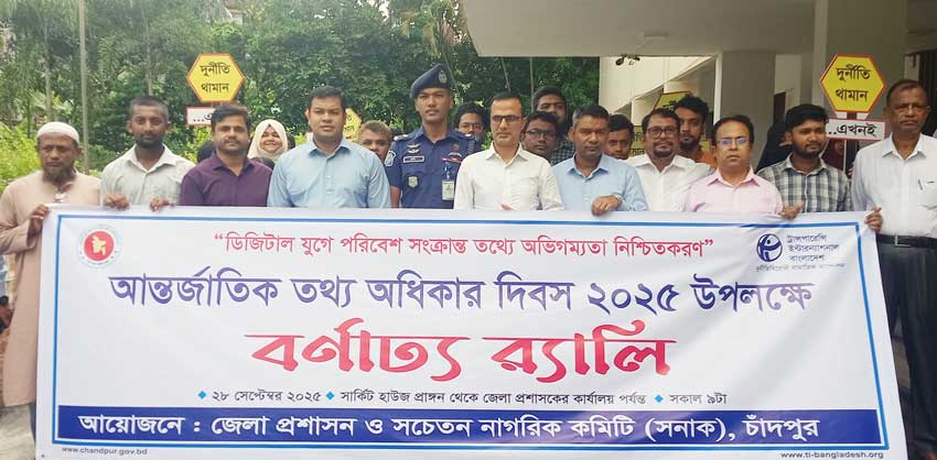 আন্তর্জাতিক তথ্য অধিকার দিবস-২০২৫ উপলক্ষে চাঁদপুরে র্যালি ও আলোচনা সভার আয়োজন করেছে জেলা প্রশাসন ও সচেতন নাগরিক কমিটি (সনাক)-টিআইবি। রোববার সকালে আয়োজিত এ কর্মসূচির মূল প্রতিপাদ্য ছিল—“ডিজিটাল যুগে পরিবেশসংক্রান্ত তথ্যে অভিগম্যতা নিশ্চিতকরণ”।
