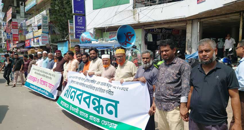 ইসলামী ব্যাংকে অবৈধ নিয়োগ বাতিলের দাবিতে চাঁদপুরে মানববন্ধন