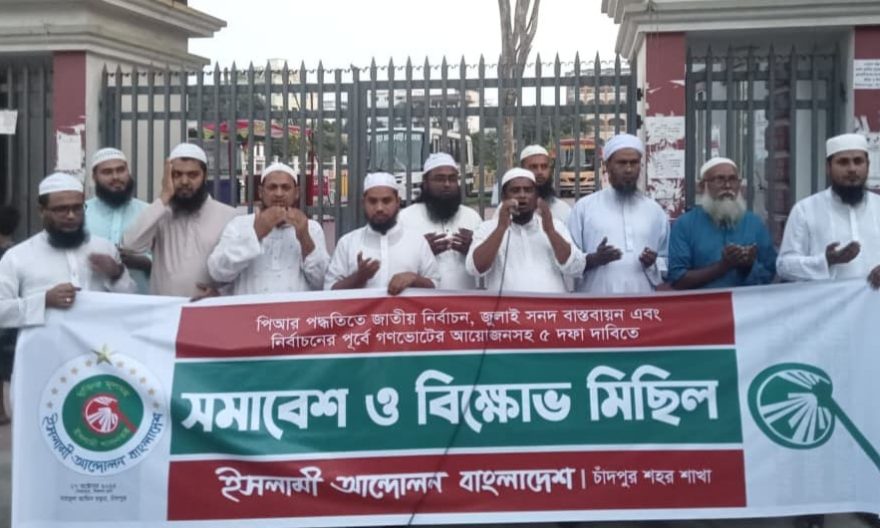 আগামী জাতীয় নির্বাচনের আগে জুলাই সনদ বাস্তবায়ন, তার ওপর গণভোট আয়োজন, নির্বাচনে উভয় কক্ষে পিআর পদ্ধতি চালু, সকলের জন্য লেভেল প্লেয়িং ফিল্ড নিশ্চিত, ফ্যাসিস্ট সরকারের জুলুম-নির্যাতন ও দুর্নীতির বিচার এবং জাতীয় পার্টি ও ১৪ দলের কার্যক্রম নিষিদ্ধের দাবিতে ইসলামী আন্দোলন চাঁদপুর শহর শাখার উদ্যোগে সোমবার বিকেল ৪টায় শহরের বিপণীবাগ জেলা কার্যালয়ের সামনে বিক্ষোভ মিছিলপূর্ব সমাবেশ অনুষ্ঠিত হয়।