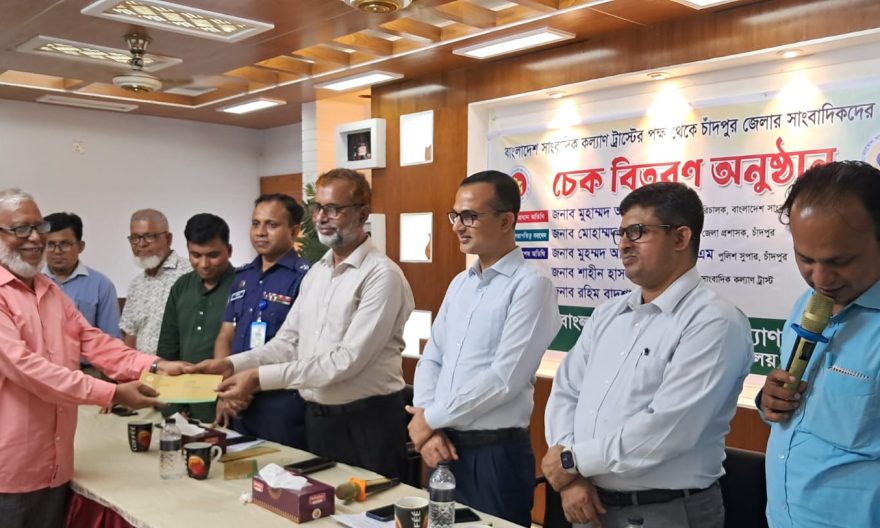 বাংলাদেশ সাংবাদিক কল্যাণ ট্রাস্টের পক্ষ থেকে চাঁদপুর জেলার ১৯ জন সাংবাদিকের মাঝে প্রায় ১৩ লাখ টাকার চেক বিতরণ করা হয়েছে।